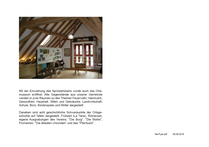 Mit der Einweihung des Sprützehüüsli's wurde auch das Ortsmuseum eröffnet. Alte Gegenstände aus unserer Gemeinde werden in zwei Räumen zu den Themen Feuerwehr, Handwerk, Gesundheit, Haushalt, Sitten und Gebräuche, Landwirtschaft, Schule, Büro, Kinderspiele und Militär dargestellt.